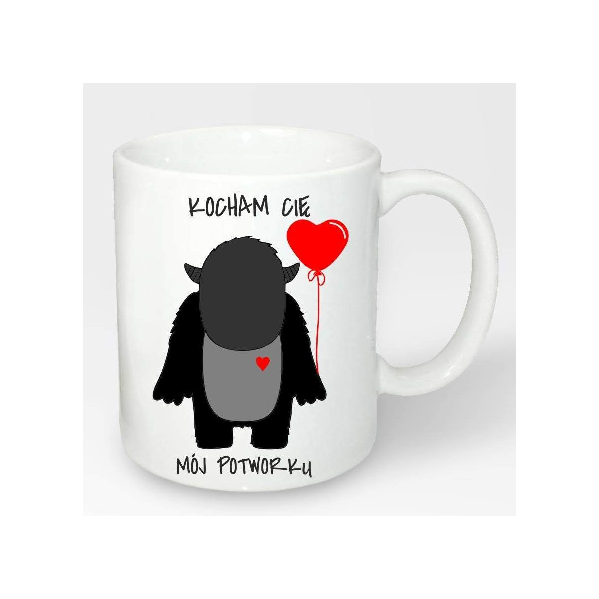 Kubek z potworkiem idealnie nada się na Walentynki. Aby zachować pierwotny stan grafiki zalecamy mycie ręczne.